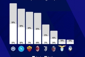 外媒预测意甲球队闯进前五概率:国米99% 那不勒斯90% 罗马84%